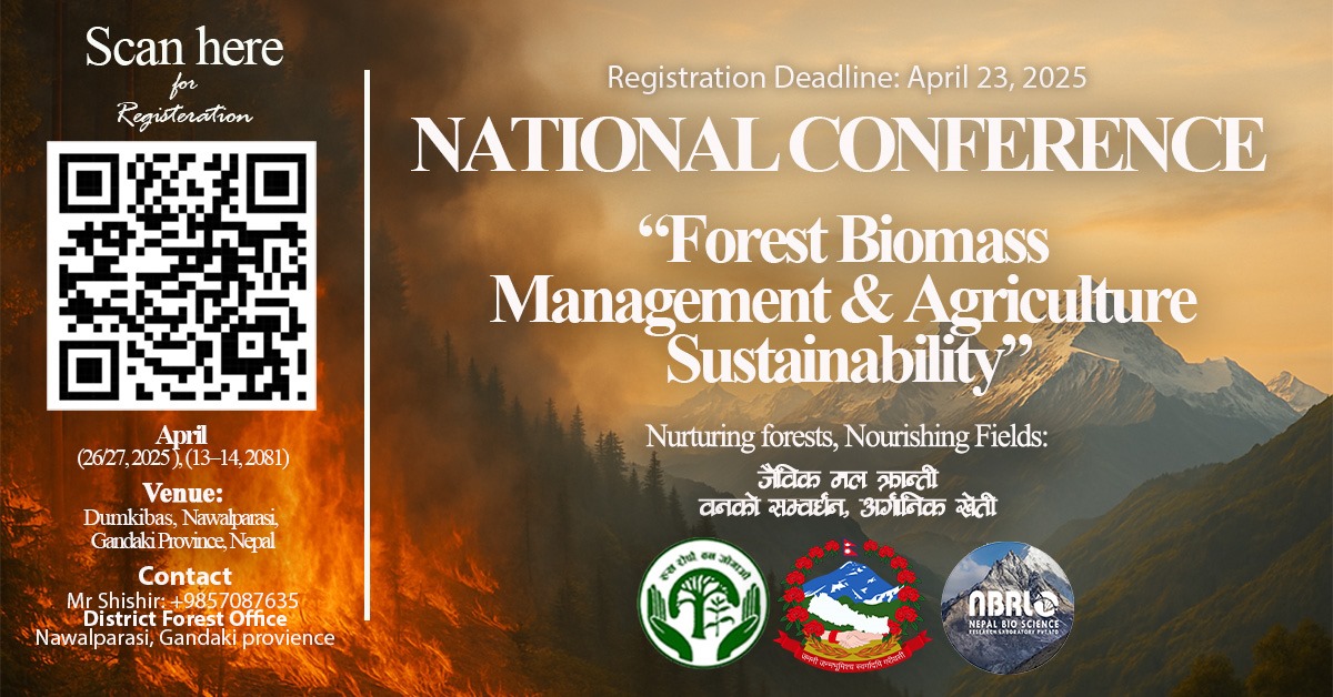 “वन बायोमास व्यवस्थापन र कृषि दिगोपनमा आधारित पहिलो राष्ट्रिय सम्मेलनमा हार्दिक निमन्त्रणा” डिभिजन वन कार्यालय नवलपुर तपाईंलाई "वन बायोमास व्यवस्थापन र कृषि दिगोपनमा आधारित पहिलो राष्ट्रिय सम्मेलन" मा सहभागीता तथा आतिथ्यताको लागी हार्दिक निमन्त्रणा गर्दछ । यो सम्मेलन २०८२ वैशाख १३–१४ (अप्रिल 26–27, 2025) मा दुम्किबास, नवलपरासी, गण्डकी प्रदेशमा विनयी त्रिवेणी गाउँपालिका, बिनयी सामुदायि